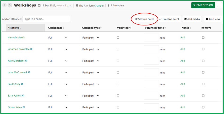 Session notes in Upshot provide a space to leave other information attached to the Register for a specific Session within an Activity. There are many possible use cases for session notes, in this instance the names of the attendees that were expected to turn up to that particular session could be recorded here. You could also use this space to record any reasons for non-attendance if anyone has provided this.