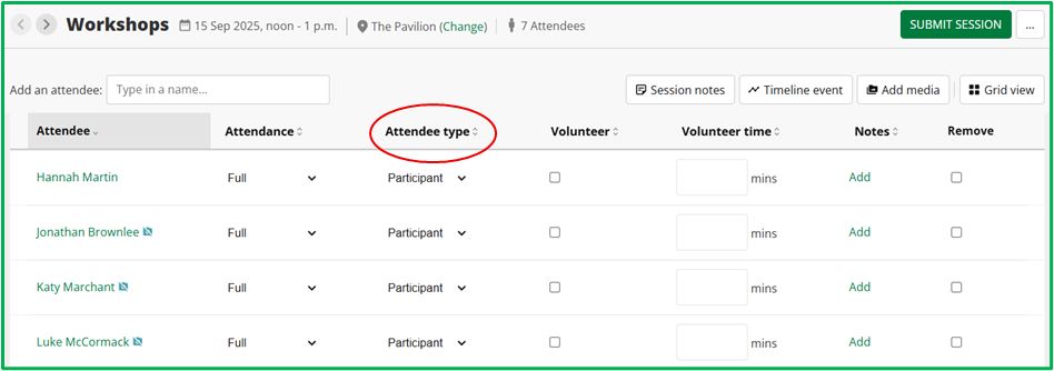 Within the register in Upshot, it is possible to change the Attendee Type. By default all attendees are entered into the register as 'Participant', however this can be changed. If the organisation isn’t already using the other attendee type options, they could be used to represent non-attendance.