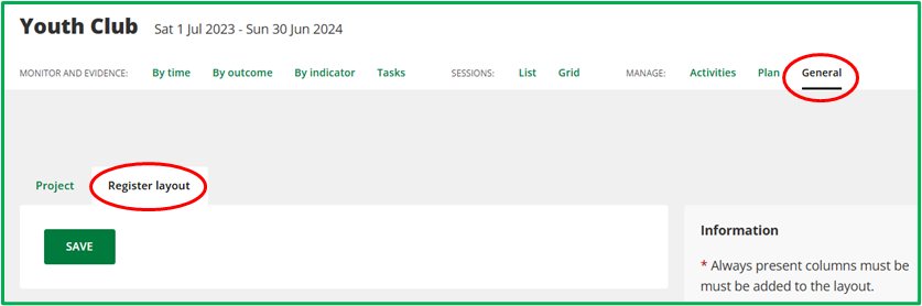 The default Register Fields that are visible within an organisation's registers can be set on a project by project basis and amended by users with the Project Manager role. This can be found within the General tab within a Project and then going to the Register Layout page.