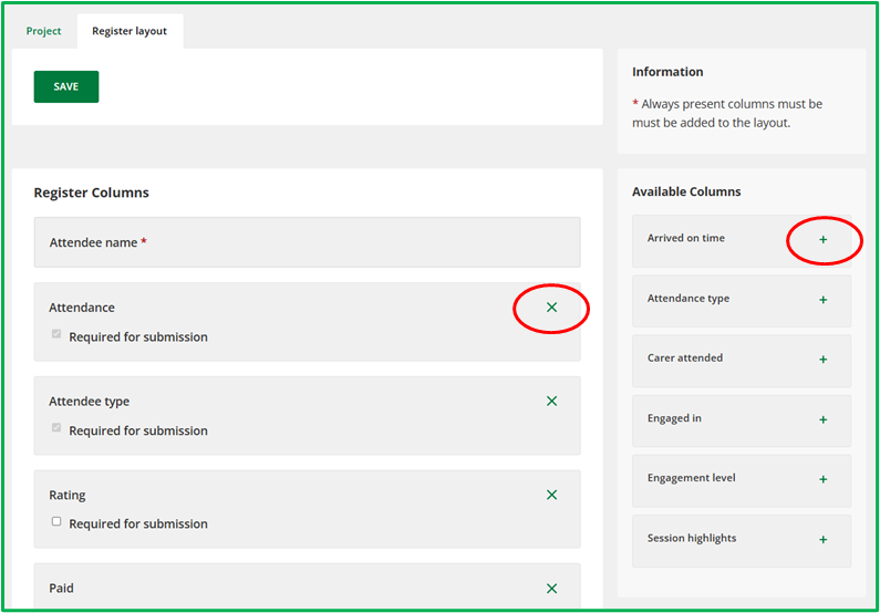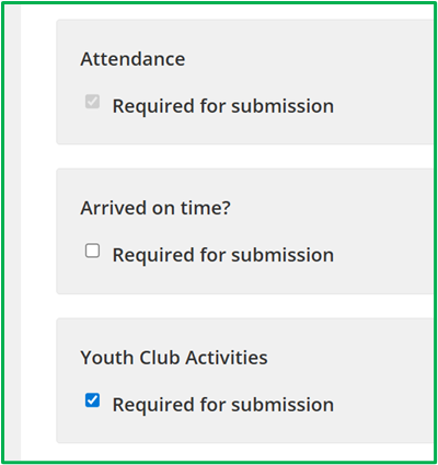 Alongside adding your Register Columns to the Register layout, they can also be made required for submission. This prevents users from submitting a register unless they have entered data for each attendee added to the particular register. This may be useful to ensure data completion where it is essential to collect this piece of data for a particular funding or safeguarding requirement. A Register Field can be marked as required by selecting its tick box within the Register layout page alongside “Required for submission.” For example, in the below image, the custom field of Youth Club Activities has been made required. This requirement can equally be turned off at any time. The fields of Attendee type and Attendance cannot have their requirement for submission removed, as these fields are always populated if included in the Register layout. However, they do not necessarily have to be included in the Register.