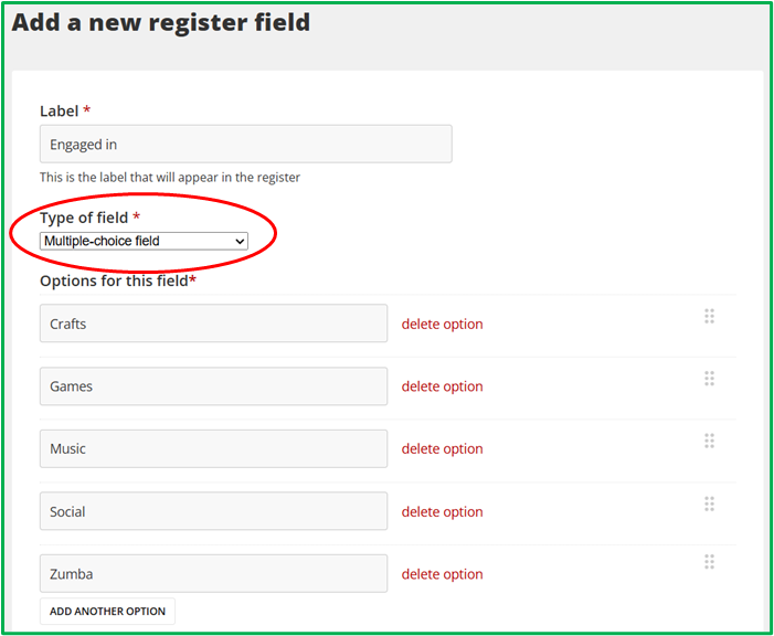 Within the Add a new register field page, users can then specify the label of the column, as well as the Type of field. For single-choice dropdown and multiple-choice dropdown columns, the options for these dropdowns will also need to be entered.