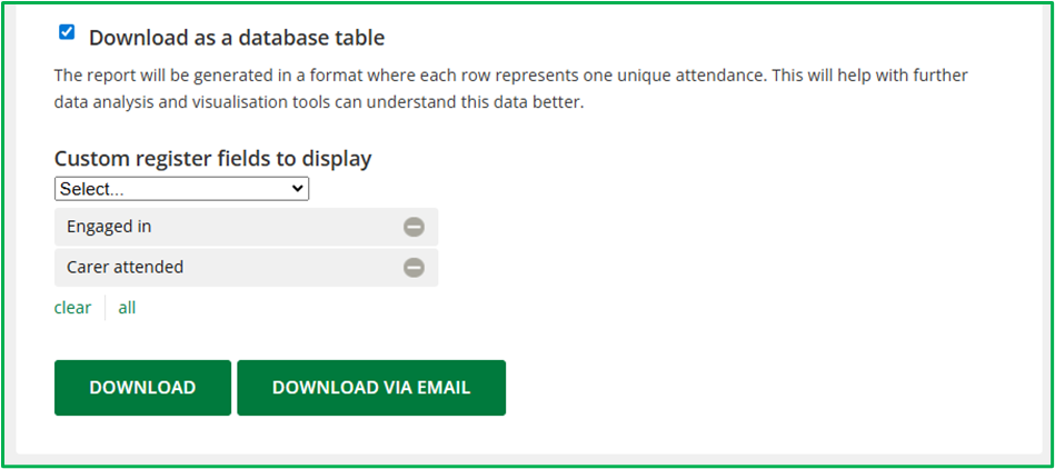 Custom Register Fields can be reported on by using the database format of the Attendance Report. To do so, ensure that the tick box within the Attendance Report Download as a database table is ticked.