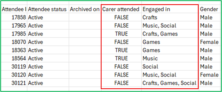 Columns will be ordered in alphabetical order. Tick box fields will have a TRUE or FALSE value for those registers which have been submitted including these fields. Multiple-choice fields will have all options selected exported in one column.