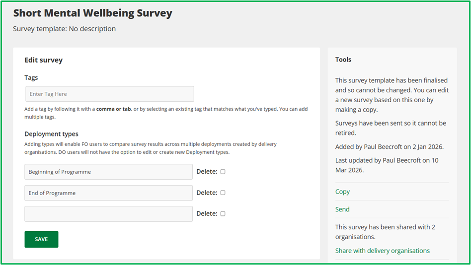 Facilitating Organisations (FO) can now optionally set deployment types for any Standard or Anonymous surveys they create.
