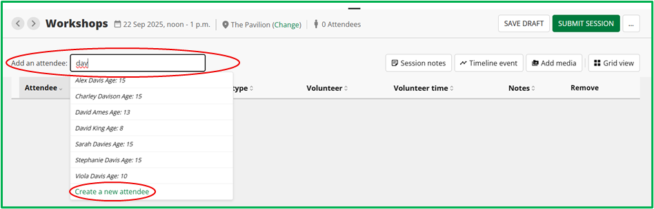 If the person you are looking for is not on the system you can click on CREATE A NEW ATTENDEE from within the dropdown. This will add them onto the register and to the system, so you will not need to enter all their details again.