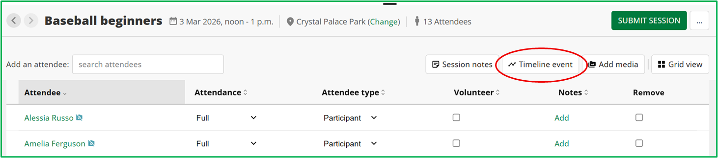 You can also add timeline events from a session for individuals or multiple attendees. This can be done from a session register.